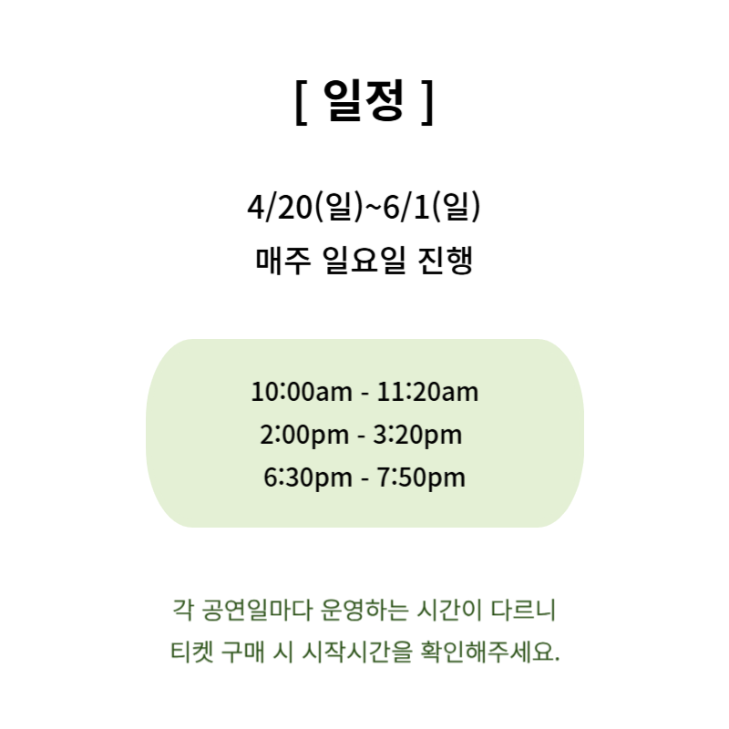 * 내부 사정에 따라, 쉬어가는 날짜가 있을 수 있으니 티켓 구매 시 날짜를 꼭 확인해주세요.