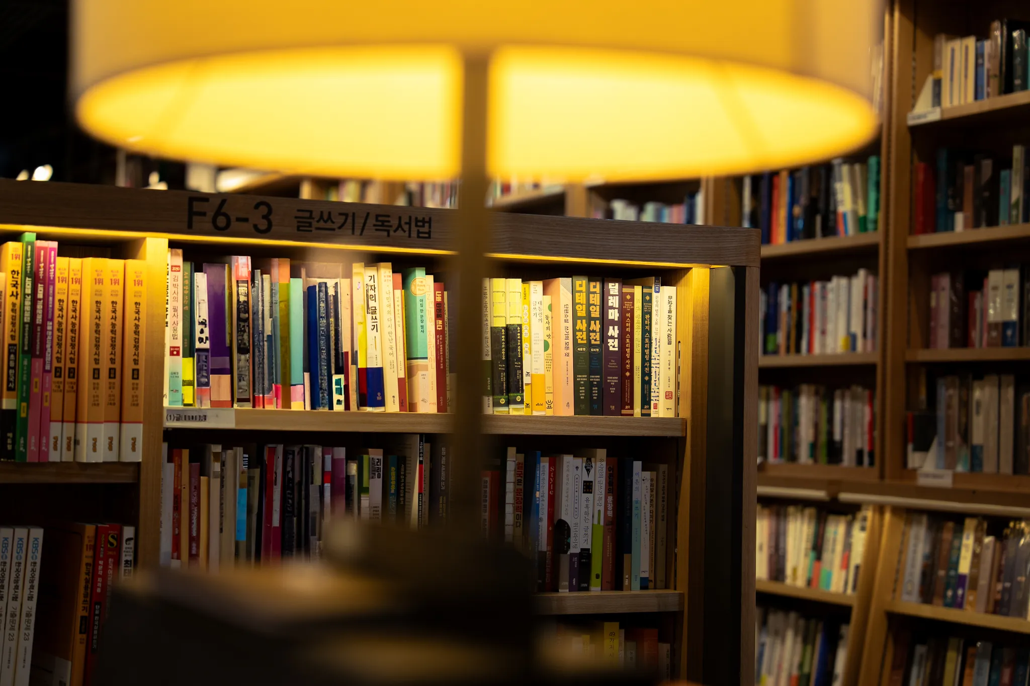 따뜻한 조명 아래 신비롭게 빛나는 서점 속