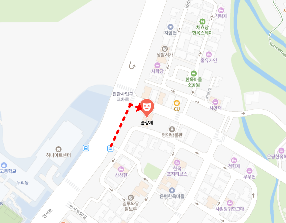 대중교통 1. 연신내역 3번출구 '연서시장' 버스정류장에 7211, 701, 709번 버스 승차 후 '하나고, 삼천사, 진관사 입구' 버스정류장에서 하차 2. 버스를 내리면 보이는 은평한옥마을(진관사 입구)에서 도보 1분거리에 있습니다. |