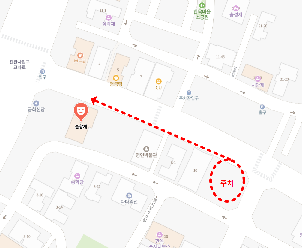 * 인근에 한옥마을주차장이 있으나, 사설 주차장으로 지원이 어렵습니다.